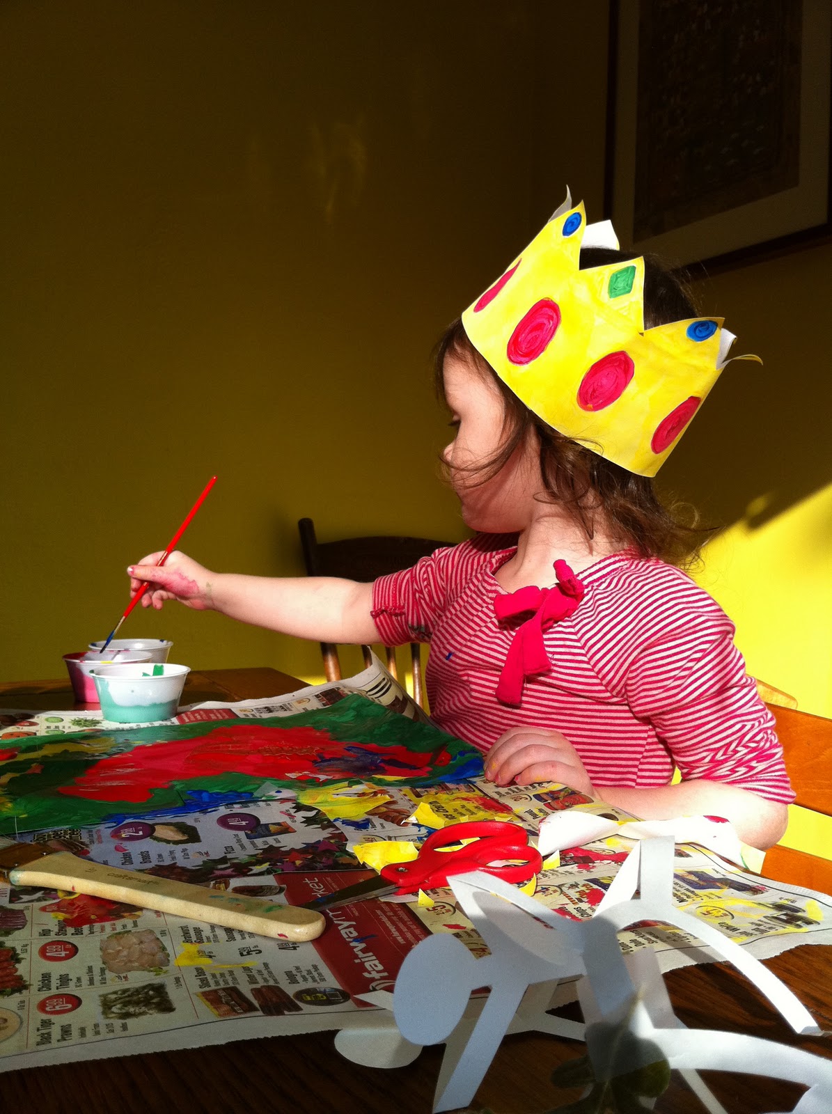 You cut paper dolls, paint paper crowns, glue googly eyes and sprinkles and macaroni and lentils and absolutely anything else onto brightly-coloured construction paper, let it dry and hang it on the fridge (if you can find room). And if you're as lucky as I am, you really enjoy it.